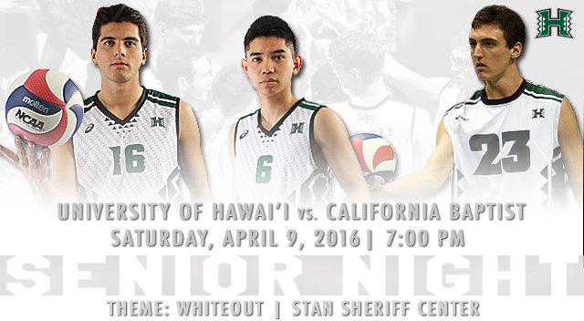 The Rainbow Warriors will take on the Cal Baptist Lancers in the last night of the conference season. This is the last game to be played in the Stan Sheriff Center for the season. For those heading down to the game, don't forget to wear white as it is a whiteout game. The three seniors Sinisa "Siki" Zarkovic (Belgrade, Serbia), Kolby Kanatake (Honolulu, HI), and Brandon Hiehle (Redondo Beach, CA) will be honored following the end of tonights match.